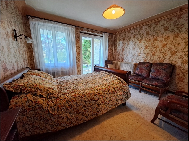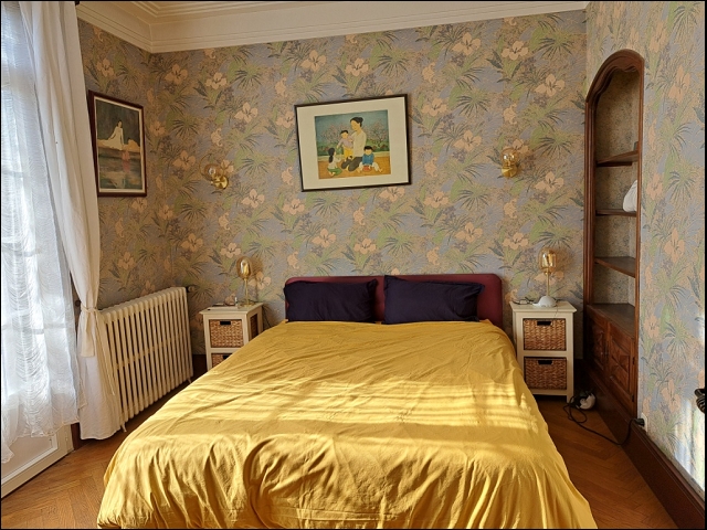 -Chambre de 11 m² avec plafond à moulure, parquet et porte-fenêtre vers terrasse