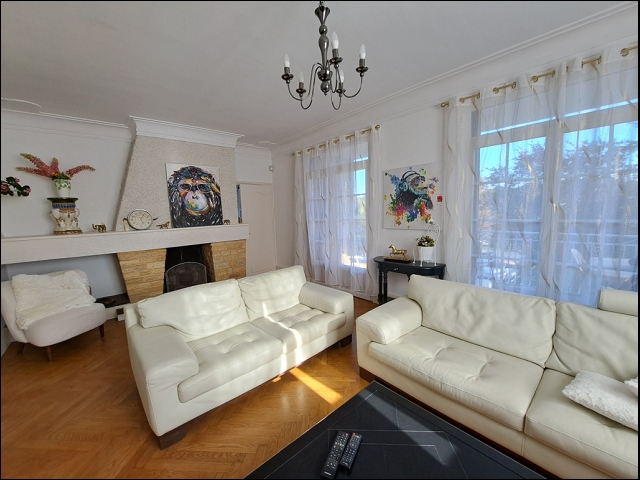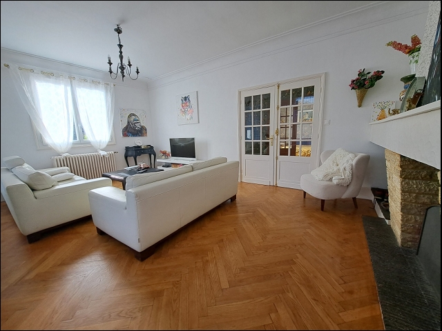 -Salon de 25 m² avec cheminée ouverte, parquet, 2 portes-fenêtres vers autre terrasse de 12 m²