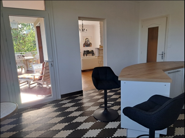 -Séjour avec cuisine équipée de 22,50 m², sol carrelé, porte vitrée vers terrasse de 12 m²