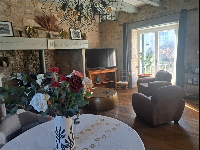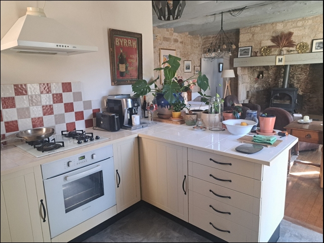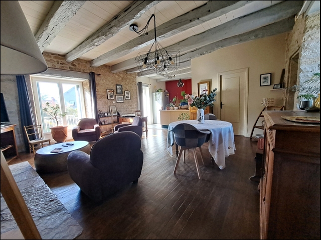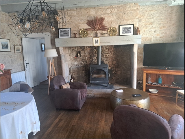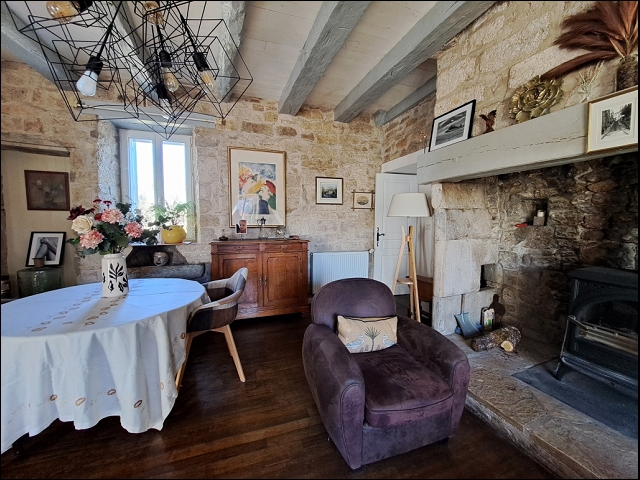 -Grand séjour de 40 m² avec cuisine équipée ouverte, sol parquet, cheminée avec poêle à bois, pierres et poutres apparentes, évier en pierre et 2 portes-fenêtres vers terrasse
