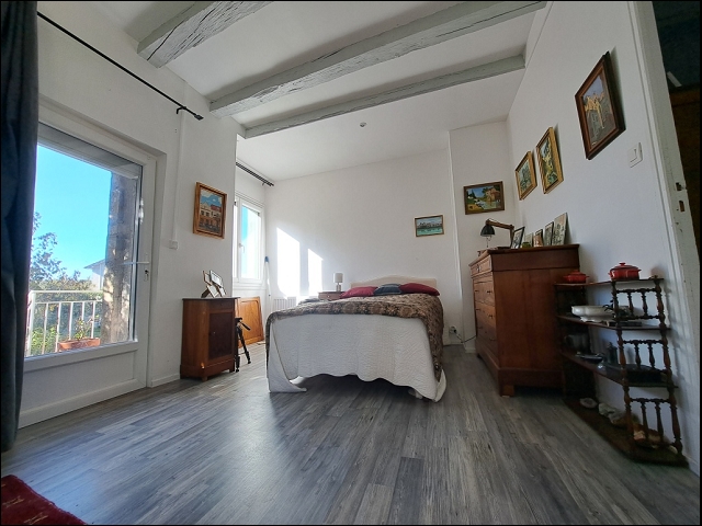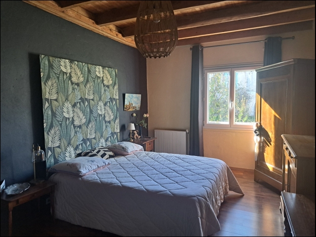 -Chambre de 15 m² avec poutres apparentes, sol stratifié et porte-fenêtre vers terrasse