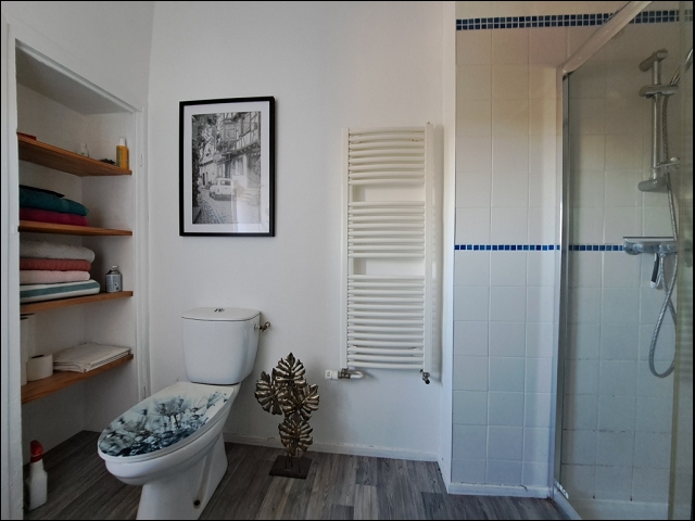 -Salle d’eau de 5 m² avec douche, WC, vasque sur meuble, sèche-serviette, sol stratifié