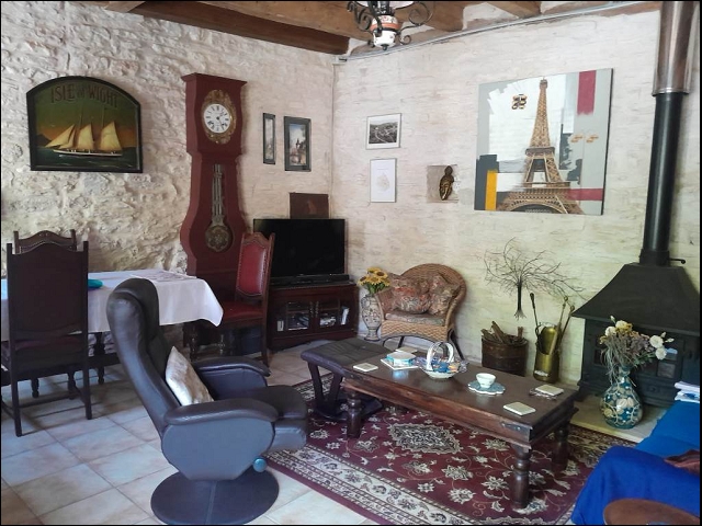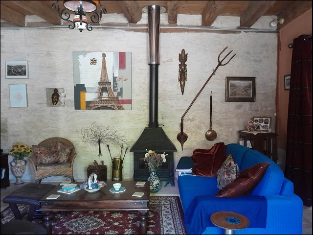 -Séjour de 25,50 m² avec poêle à bois, porte fenêtre vers cour, pierres et poutres apparentes, sol carrelé