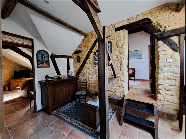 -Palier de 10 m², pierres et poutres apparentes, sol carrelé