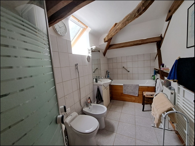 -Salle de bain de 6,50 m² avec baignoire, WC broyeur, bidet, vasque sur meubles, grande douche & sèche-serviettes électrique