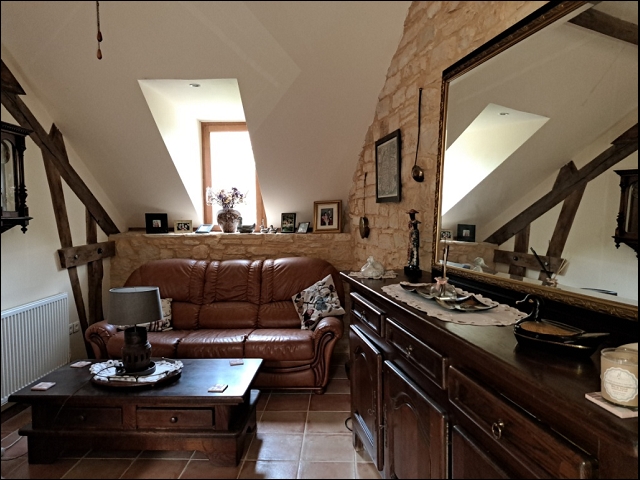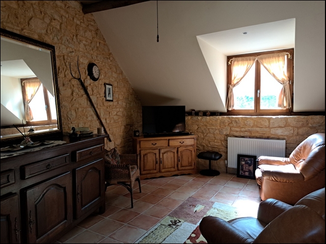 -Salon de 22 m², pierres & poutres apparentes, sol carrelé