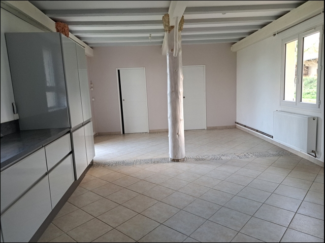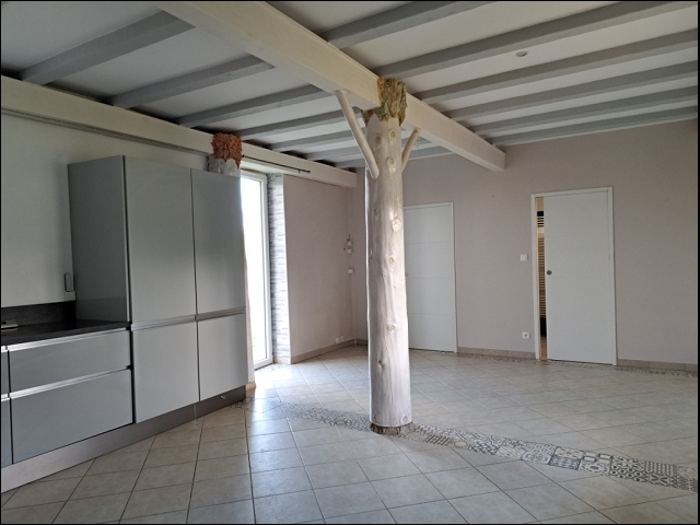 -Séjour de 38 m² avec cuisine équipée, poutres apparentes, sol carrelé, porte vitrée, escalier vers l’étage