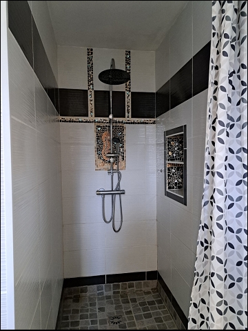 -Salle d’eau de 7,35 m² avec grande douche à l’italienne, vasque sur meuble, sèche-serviette, murs carrelés, sol stratifié