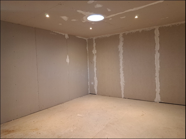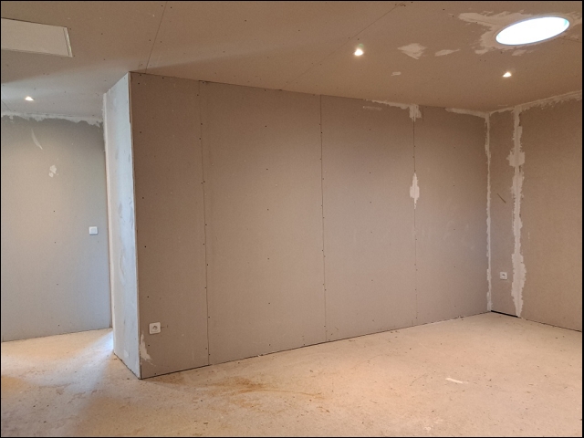 -Salon de 22 m² à finir d’aménager (murs en placo, sol cimenté), 2 puits de lumière