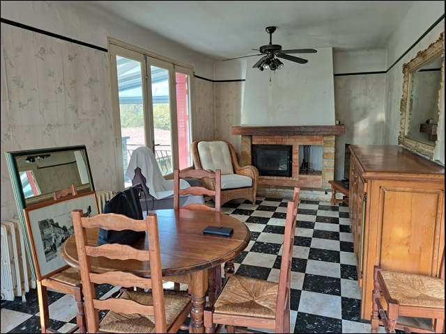 - Séjour de 28 m² avec coin cuisine avec placards, cheminée avec insert, 2 portes-fenêtres vers véranda, sol en marbre